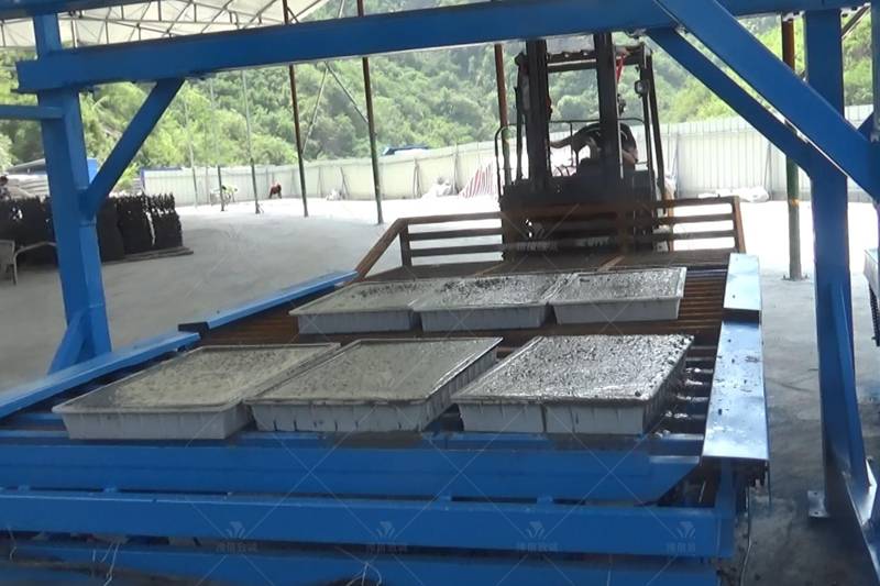 縉云縣縉云交通集團深坑隧道出口排水溝蓋板預制現場,利用預制件設備自動化灌裝混凝土,自動化生產水溝蓋板。